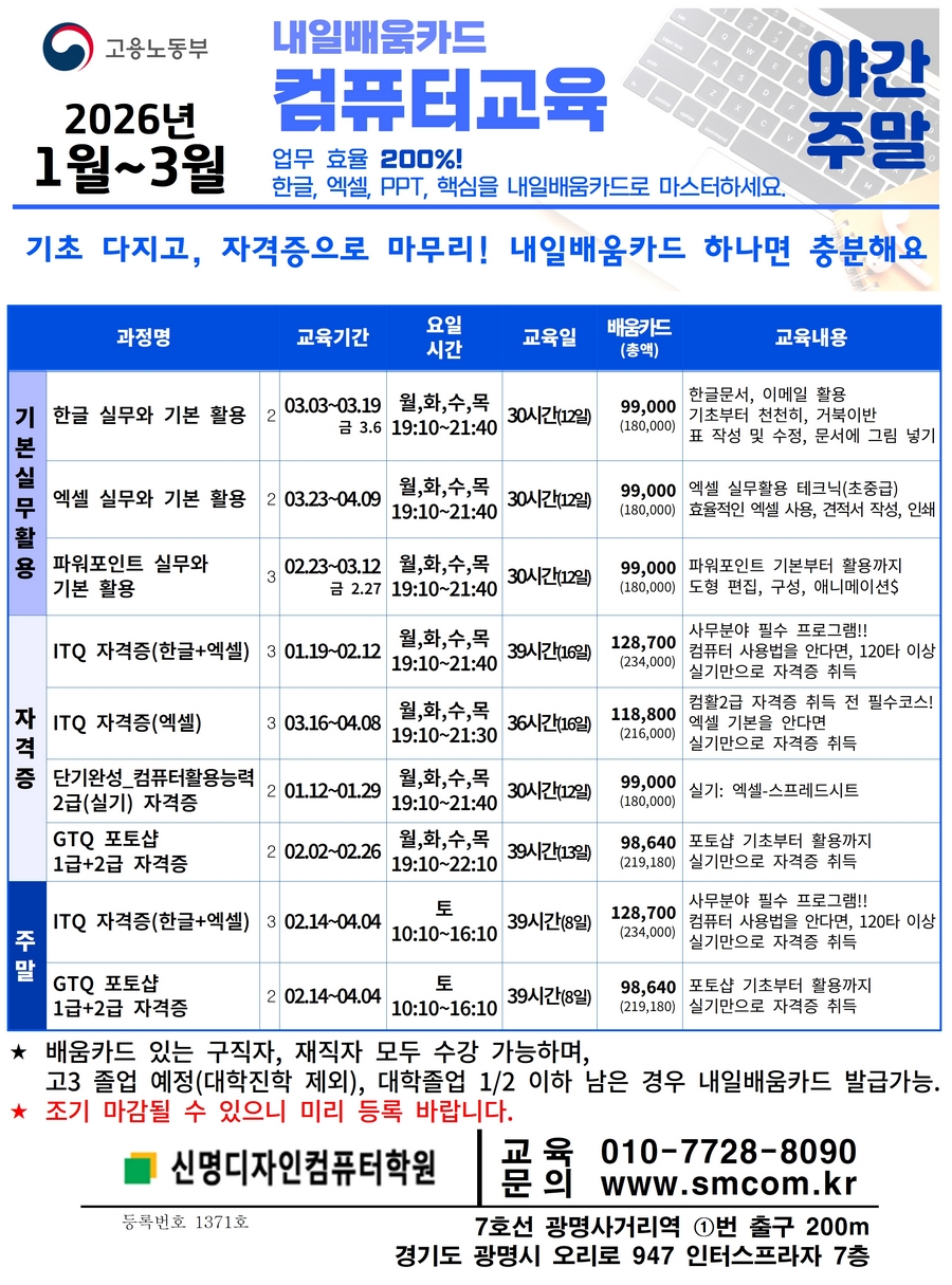 Á¦¸ñ [¡Ù ¾ß°£.ÁÖ¸» - ¹è¿òÄ«µå] ÄÄÇ»ÅÍ ±³À° (2026³â 1¿ù~3¿ù) ÀÛ¼ºÀÏ 2025.12.24 (71ȸ)