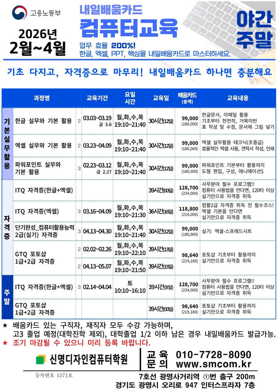 Á¦¸ñ [¡Ù ¾ß°£.ÁÖ¸» - ¹è¿òÄ«µå] ÄÄÇ»ÅÍ ±³À° (2026³â 2¿ù~4¿ù) ÀÛ¼ºÀÏ 2026.01.30 (55ȸ)